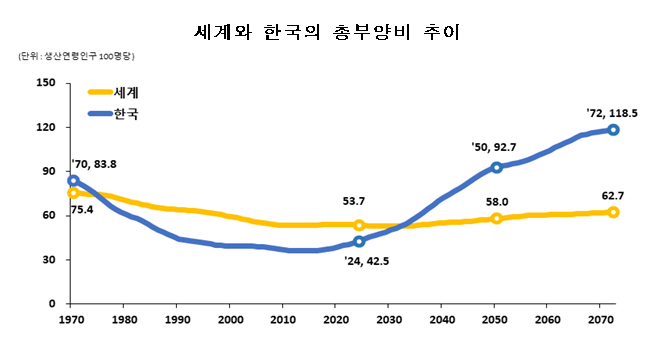 노년부양비는 생산가능인구(15-64세) 100명당 부양해야 할 65세 이상 고령인구의 비율을 나타내는 지표로, 한국의 노년부양비는 2072년에 세계 3위 수준으로 급증할 것으로 예측된다. 이는 경제활동인구의 부담이 크게 증가함을 의미하며, 사회보장제도와 경제 전반에 큰 압박으로 작용할 수 있다.더불어 한국인의 기대수명도 크게 증가할 전망이다. 2072년 한국인의 기대수명은 91.1세에 달할 것으로 예상되며, 이는 현재보다 약 8년 정도 늘어난 수치이다. 기대수명의 증가는 긍정적인 측면도 있지만, 동시에 노인 인구의 장기 부양에 대한 사회적 부담을 가중시킬 수 있다.이러한 급격한 인구 구조 변화에 대비하기 위해서는 다음과 같은 대책이 필요할 것으로 보인다:
