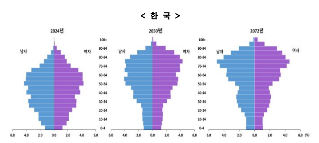 한국은 급격한 인구 구조 변화로 인해 50년 후인 2072년에는 세계에서 가장 빠르게 고령화되는 국가 중 하나가 될 전망이다. 통계청의 발표에 따르면, 한국의 고령인구(65세 이상) 비중은 2024년 19.2%에서 2072년에는 47.7%로 크게 증가할 것으로 예상된다. 이는 전체 인구의 절반에 가까운 수치로, 한국이 명실상부한 '노인의 나라'로 변모할 것임을 시사한다.이러한 급격한 고령화는 한국의 인구 순위에도 큰 영향을 미칠 것으로 보인다. 현재 세계 29위인 한국의 인구 순위는 2072년에 59위로 30계단 하락할 전망이다.