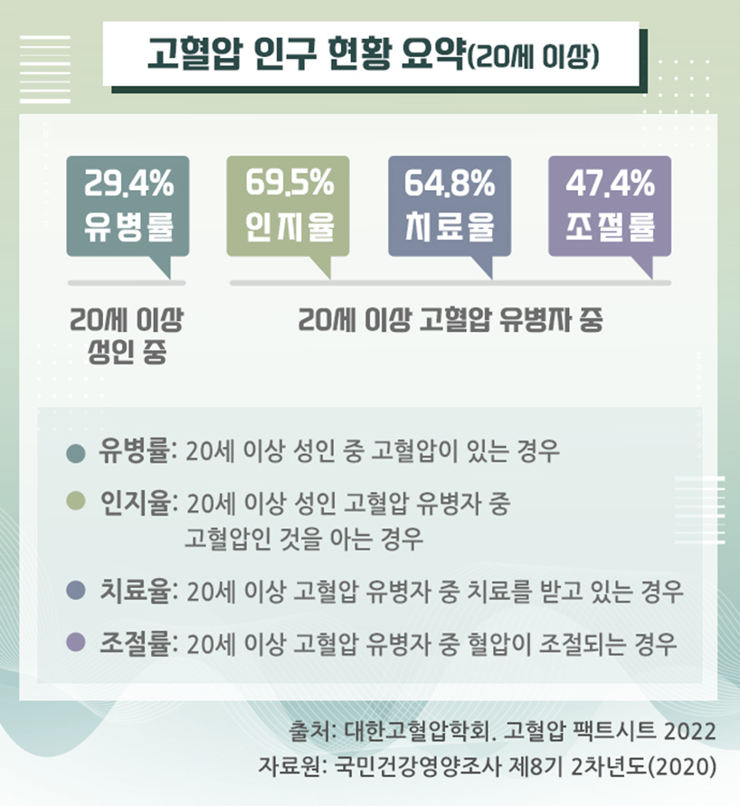 2022년 20세 이상 성인중 약 30%인 1,260만명이 고혈압을 가지고 있는 것으로 나타났으며, 이중 740만 명 즉 고혈압 인구 중 2/3만이 적절한 관리와 치료를 하고 있다고 합니다.
