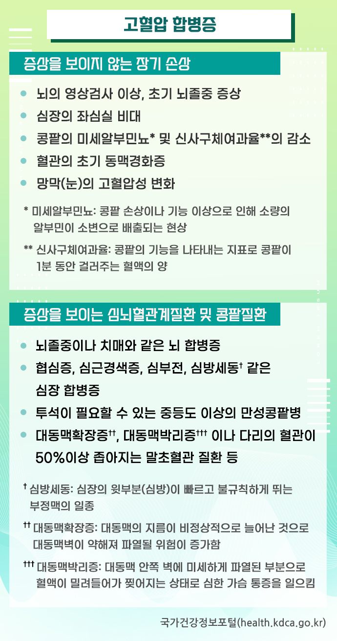 고혈압이 오래 지속되면 심장의 혈액 공급 부담이 커져서 심장이 비대해지고 심장벽이 두꺼워지게 하고, 동맥경화 발병 가능성 또한 커지게 합니다. 이렇게 두꺼워진 벽은 정상 상태에 비해 더 경직될 수밖에 없고, 심방이 정상적으로 확장되지 않아 혈액이 원활히 공급되기가 어려워지게 하며 심장에 부담을 주게 됩니다. 이러한 심장의 변화는 이상 심장 박동 또는 심부전등을 가져올수 있으며, 갑작스러운 심근 경색이나, 뇌졸중, 혈관성 치매와 같은 질병을 가져올 수 있습니다.