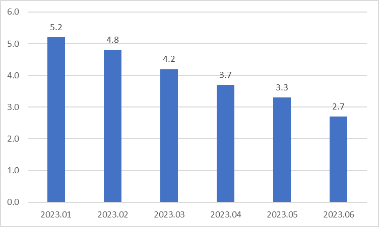2023년 현재 통계청 기준 소비자 물가 등락률을 보면 전체적으로 하락하고 있는 추세를 볼 수 있습니다.