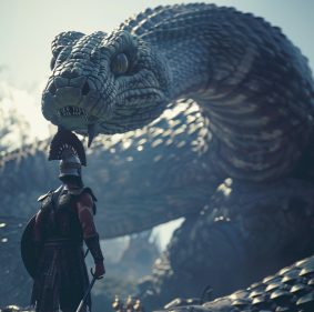 거대한 이무기가 바다 위로 모습을 드러내며 처녀를 삼키려 했습니다. 그 순간 청년이 외쳤습니다.