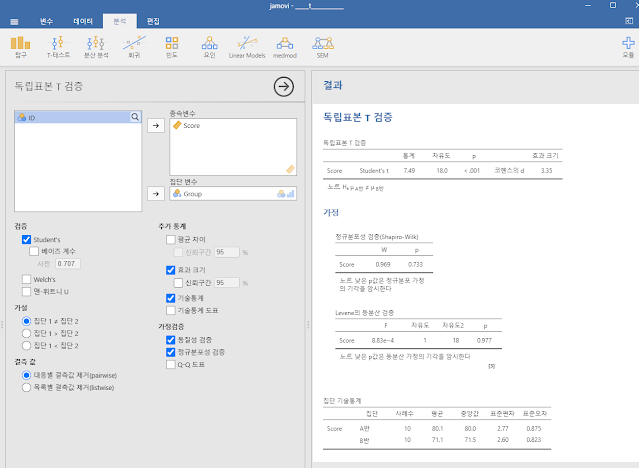 Jamovi에서 Group을 그룹변수로, Score를 종속변수로 지정하면, 평균, 표준편차, t값, p값, 효과크기까지 한 번에 확인할 수 있습니다.