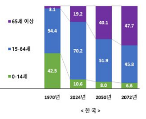 한국은 급격한 인구 구조 변화로 인해 50년 후인 2072년에는 세계에서 가장 빠르게 고령화되는 국가 중 하나가 될 전망이다. 통계청의 발표에 따르면, 한국의 고령인구(65세 이상) 비중은 2024년 19.2%에서 2072년에는 47.7%로 크게 증가할 것으로 예상된다. 이는 전체 인구의 절반에 가까운 수치로, 한국이 명실상부한 '노인의 나라'로 변모할 것임을 시사한다.이러한 급격한 고령화는 한국의 인구 순위에도 큰 영향을 미칠 것으로 보인다. 현재 세계 29위인 한국의 인구 순위는 2072년에 59위로 30계단 하락할 전망이다.