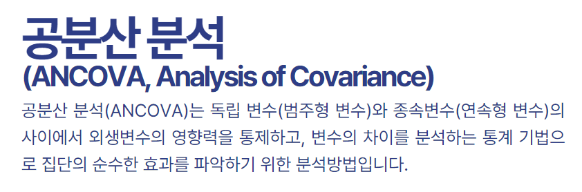 공분산 분석은 독립 변수의 효과를 확인하면서 외생 변수(연속형 변수)의 영향을 제거하고, 독립 변수와 종속 변수 간의 관계를 더 명확히 파악하는 데 사용되는 분석방법입니다.