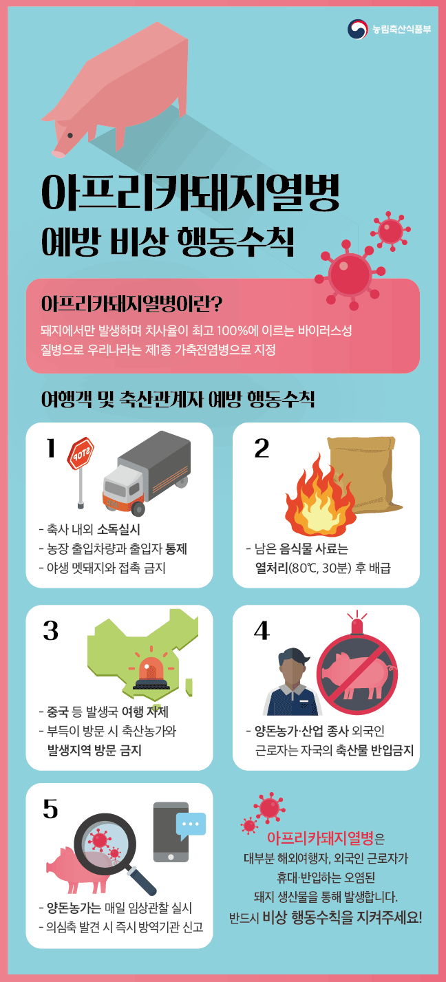 아프리카돼지열병은 1921년 아프리카 케냐에서 최초로 발생 보고된 이병률이 높고 급성형에 감염되면 치사율이 거의 100%에 이르기 때문에 양돈 산업에 엄청난 피해를 주는 질병으로, 치명적인 바이러스성 출혈성 돼지 전염병으로 병원성에 따라 보통 고병원성, 중병원성 및 저병원성으로 분류됩니다. 아직까지 치료제나 백신이 존재하지 않는 것으로 알려져 있어, 이 질병이 발생하면 세계동물보건기구(OIE)에 발생 사실을 즉시 보고해야 하며 돼지와 관련된 국제교역도 즉시 중단되게 되어있습니다. 우리나라에서는 이 질병을 가축전염병예방법상 제1종 법정전염병으로 지정하여 관리하고 있습니다