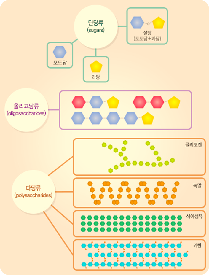 - 다당류: 수십 ~ 수천개 이상의 단당류가 결합된 중합체. 녹말, 글리코겐, 식이섬유, 키틴 등